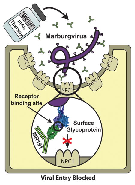Further, the crystal structure illustrates that the potent therapeutic antibody MR191 binds into the receptor-binding site near the apex of GP1. In ebolaviruses, this site is inaccessible due to the position of the glycan cap in the absence of cathepsin cleavage. However, in the marburgvirus GP, the polypeptide region equivalent to the ebolavirus glycan cap appears to be flexible and does not as effectively block access of antibody to the receptor-binding site. MR191 competes with NPC1-C for binding of GP and appears to mimic NPC1-C (Wang et al., 2016) in its attachment. Contact residues for MR191 are also essential for receptor binding and are highly conserved among related filoviruses. The conservation and importance of its binding site suggests that the footprint of MR191 may be somewhat more resistant to mutagenic escape than other, less conserved antibody epitopes. Interestingly, however, those escape mutations that do arise in cell culture occurred in distant sites, suggesting an allosteric conformational change or an as-yet unknown role of these regions in maintenance of GP quaternary structure.