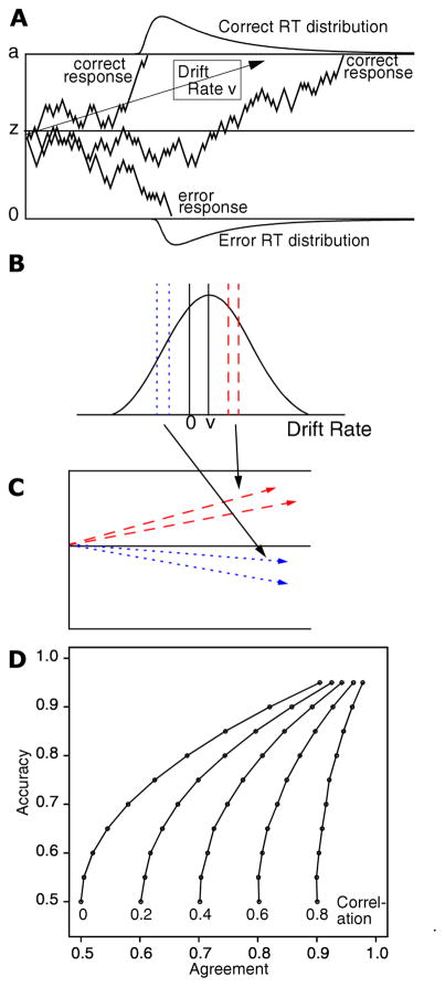 A: An illustration of the diffusion model. There are three simulated paths with mean drift rate v, starting point z, and boundary separation a. One process hits the top boundary quickly, another hits it later, and another hits the bottom boundary in error. This also shows how the model predicts the right-skewed shapes of RT distributions: most processes hit the boundary quickly but some hit later. B: A distribution across trials of perceptual strength (or drift rate) with mean v and standard deviation η. One of the red dashed and blue dotted lines is a random sample from the distribution and the other illustrates a correlated sample from the identical stimulus. C: This shows the mapping into drift rates. D: Examples of binomial random variables with probability (accuracy in the experiments) on the y-axis and the probability of agreement between a first and a repeated sample on the x-axis. The different curves represent different correlations between the two samples.
