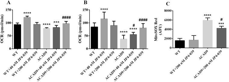 Effect of JP4-039 on basal respiration (A), maximal respiration (B) and superoxide production (C) in ACAD9 deficient fibroblasts cultured in media without glucose for 48–72 h. Cells were exposed to JP4-039 (40 nM or 200 nM) during 24 h. Data are means ± SD. ***P < 0.001, ****P < 0.0001, compared to wilt type (WT) cells; #P < 0.05, ####P < 0.0001, compared to ACAD9 deficient cells (Tukey multiple range test).