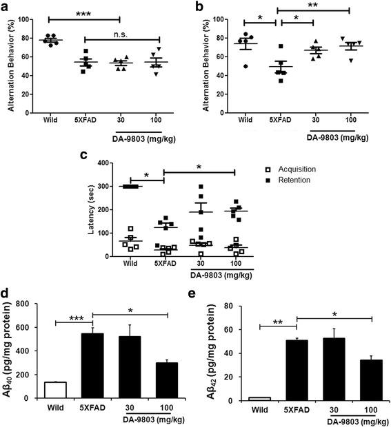 Chronic treatment with DA-9803 restores behavioral deficits and decreases Aβ levels in cortices of 5XFAD mice. a, b Alternation behavior in a Y-maze before (a) and after (b) 4-week chronic DA-9803 treatment in 5-month-old 5XFAD mice (n = 5 mice/group). c Latency of entry into the dark compartment on a passive avoidance test after 4-week DA-9803 treatment (n = 5 mice/group). d, e Total Aβ40 (d) and Aβ42 (e) levels in cortices of 5XFAD mice after 4-week DA-9803 treatment (n = 5 mice/group). Mean ± SEM. *p < 0.05, **p < 0.01, ***p < 0.001. n.s. not significant, Aβ amyloid-beta