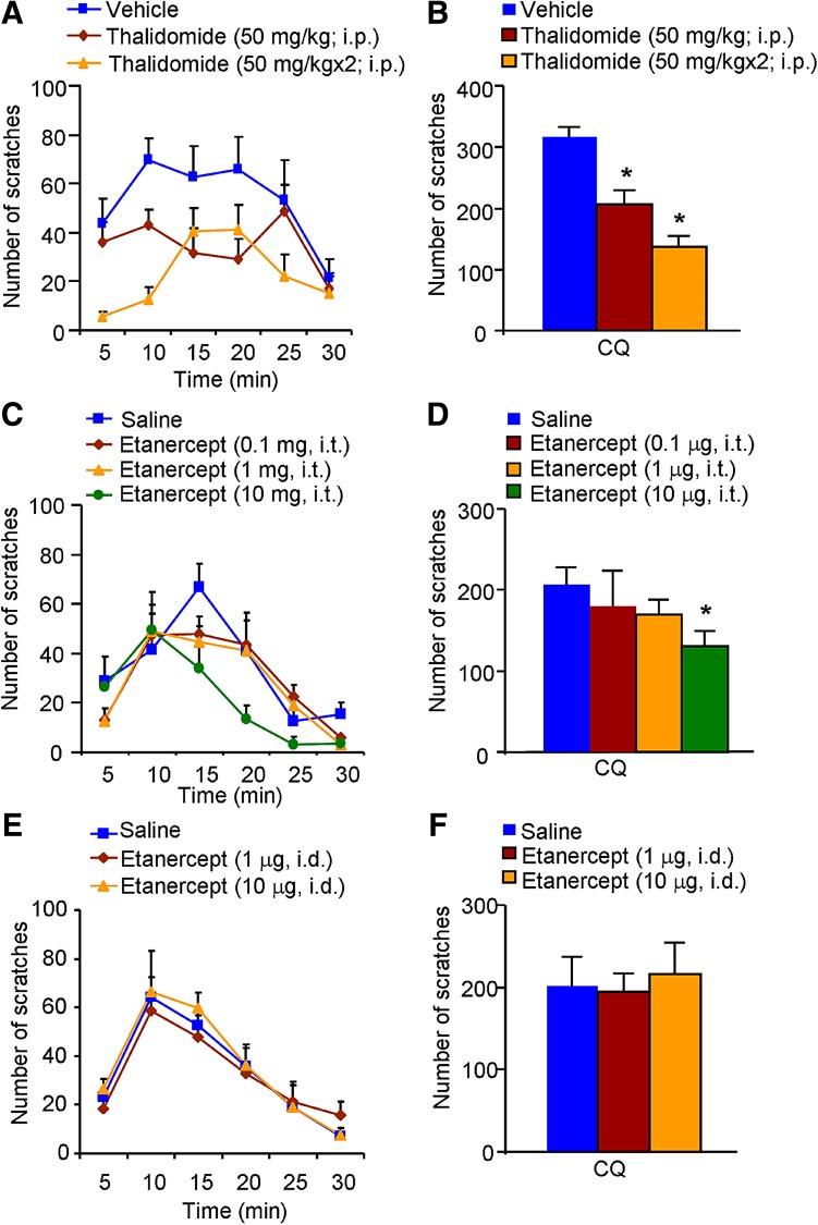 Inhibitory effects of thalidomide or etanercept on acute non-histaminergic itch in mice. A–B Time course (A) and total scratching bouts within 30 min (B) of CQ-induced itch in vehicle- and thalidomide-treated mice. C–D Time course (C) and total scratching bouts within 30 min (D) of CQ-induced itch after i.t. injection of vehicle or etanercept. E–F Time course (E) and total scratching bouts within 30 min (F) of CQ-induced itch after i.d. injection of vehicle or etanercept. Data are presented as mean ± SEM (