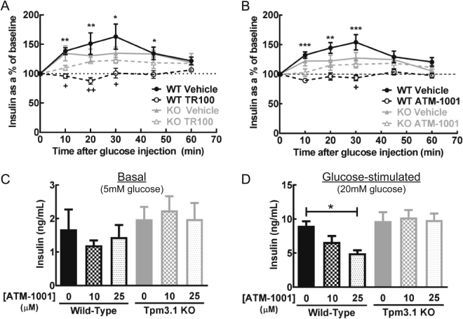 ATM drugs impact on insulin secretion. (A and B) Changes in insulin levels during a glucose tolerance test (2 g glucose/kg BW, i.p.) in wild-type (WT) and Tpm3.1 knock-out (KO) mice (n = 5/group), 1 h after (A) TR100, (B) ATM-1001 (40 mg/kg BW, i.p.) or vehicle administration. Results of statistical analysis (ANOVA with post-hoc Tukey’s multiple comparison test) are indicated by: (1) *P < 0.05; **P < 0.01; ***P < 0.001, for drug- versus vehicle-treated mice of the same genotype; and (2) +P < 0.05; ++P < 0.01, for drug-treated WT versus drug-treated KO mice. (C and D) Insulin secretion in pancreatic islets isolated from WT and Tpm3.1 KO mice treated with increasing amounts of ATM-1001 (1 h treatment). There was no impact of ATM-1001 on (C) basal (5 mM glucose) secretion, but there was a dose-dependent suppression of (D) glucose-stimulated (20 mM glucose) insulin secretion with increasing concentration of drug in WT but not KO islets. Results are mean ± SEM from n = 5 islets/group. The results of statistical analysis (ANOVA with post-hoc Tukey’s multiple comparison test) are indicated: *P < 0.05; **P < 0.01, ***P < 0.001.