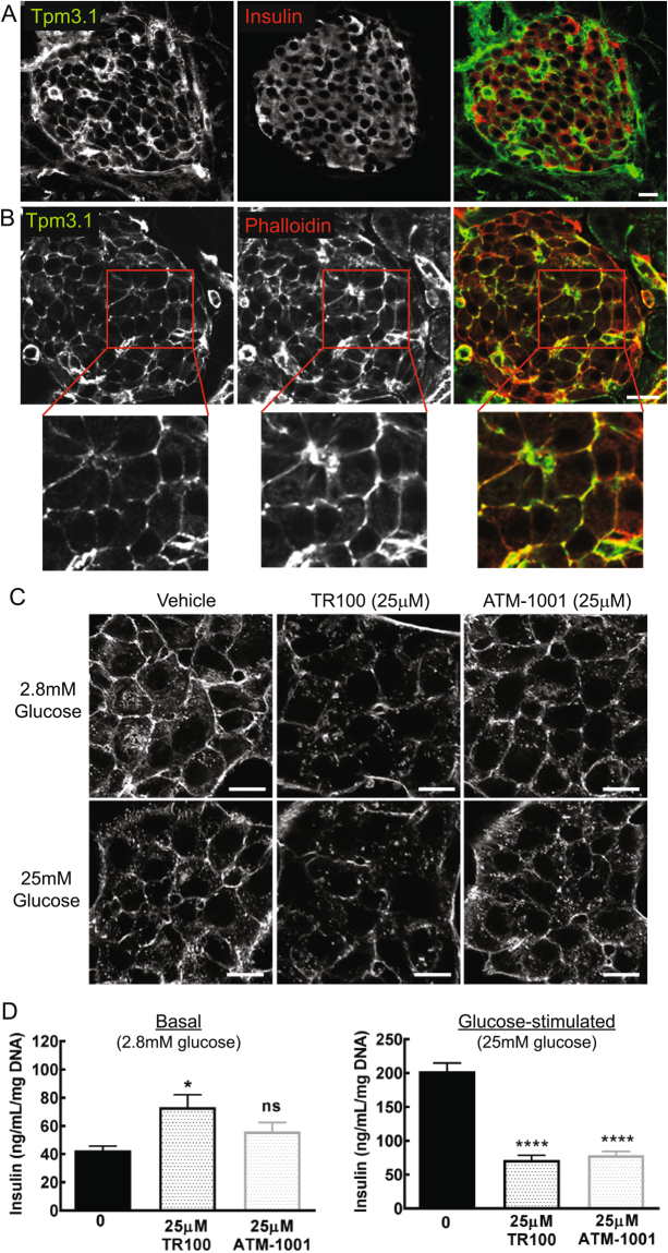 Actin plays a major role in insulin granule exocytosis in regulating the trafficking and/or insertion of the granules into the plasma membrane27. Treatment of β-cells with actin-destabilizing drugs (latrunculin) has been shown to increase insulin secretion30–32 leading to the hypothesis that the actin cytoskeleton acts as a barrier for granule exocytosis. We therefore have examined whether the impact of the ATM drugs on insulin secretion is due to alteration to the cortical actin cytoskeleton. We first demonstrate that the drug target, Tpm3.1 is present at the cell periphery in β-cells (stained with insulin) of mouse pancreas (Fig. 6A) in close association with F-actin (Phalloidin staining) (Fig. 6B) as has been observed for Tpm3.1 in other mouse tissues23.
