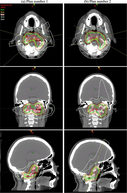 Two highly conformal treatment plans, each with three spot scanning beams, were initially generated, as shown in Fig. 3(a) and 3(b), respectively. Two plans were created so that each one could be delivered every other day to provide more robust target coverage than just one plan over the whole treatment course. Plan number 1 had left anterior oblique (LAO), right posterior oblique (RPO), and left posterior oblique (LPO) beams. Plan number 2 used RPO and right anterior oblique (RAO) beams, and a solitary vertex beam. The beam configuration of each plan is summarized in Table 1. These multifield optimized intensity‐modulated proton therapy (MFO‐IMPT) plans were generated with high priority on target coverage and normal tissue sparing with some consideration in minimizing neutron dose exposure of fetus. It is well known the secondary neutron has a forward peak. Beam angle that puts fetus at the in‐field past proton range location was not allowed and lateral beam was encouraged in the initial planning stage. The vertex beam was not rejected at this stage since it is very beneficial for robust target coverage and brainstem sparing. Fetus could have higher neutron exposure with this beam placement, but the absolute level is unknown at initial planning. Beam of plan number 1 and 2 was delivered to the phantom for one fraction, and neutron H was measured using the REM500 at the fetus position. Plans were modified based on the feedbacks from the measurement of each beam to minimize neutron H to the fetus and still provide excellent target coverage and normal tissue sparing. Measurements were repeated for each new beam in the new plan, and this iterative process continued to generate optimal plans with minimum neutron dose exposure to the fetus. The beam configurations of the final two plans are show in Table 2. The difference of the final plans from the initial plans is in plan number 2. The major change is the vertex beam was replaced with a LPO beam.