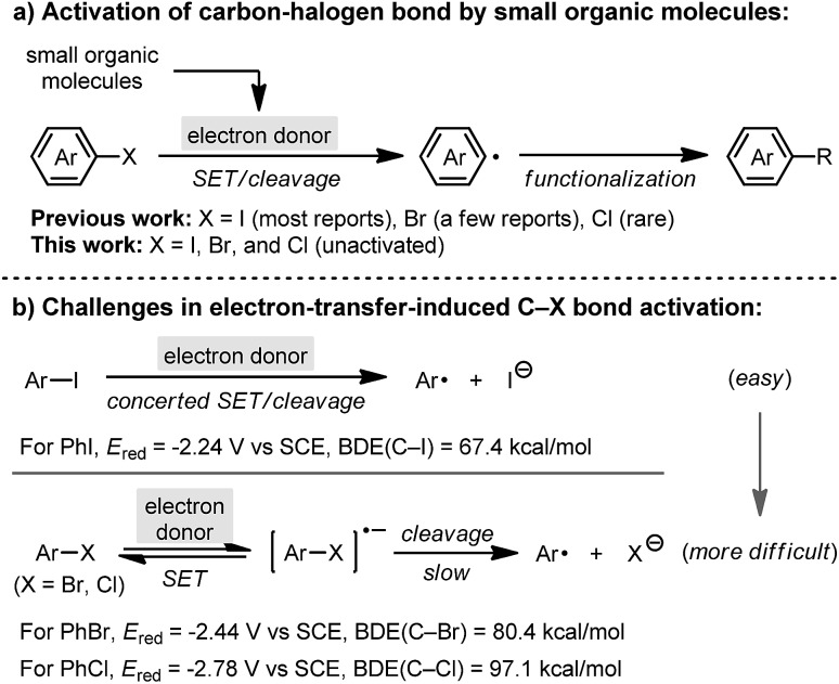 Scheme 1. Reaction mode of carbon–halogen bond activation promoted by small organic molecules and challenges therein.