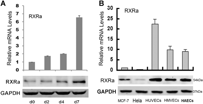 a The expression of RXRα in hMSCs cultured in EDM at days 0, 2, 4, and 7. b The expression of RXRα in cancer cells MCF-7 and HeLa, endothelial cells HUVECs, HMVECs, and HAVECs. The expression was determined by qRT-PCR and western blotting (P < 0.01, n = 3)