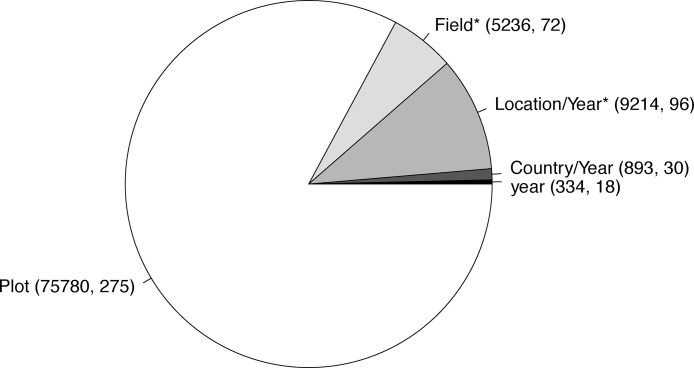 Overall, variation in inoculation response contributed considerably to yield variability, with significant variance components for location/year and fields (model 4, p < 0.0001), with variance components of 9223 and 5246 respectively. Most of the yield variation by far was due to unexplained plot-level variation, with residual variance estimated at 75,780 (Fig. 3). Inoculation response at the field level (estimated by model 2b) was significantly but weakly related to yield without inoculation (beta = −0.051, p < 0.00004, R2 = 0.015).
