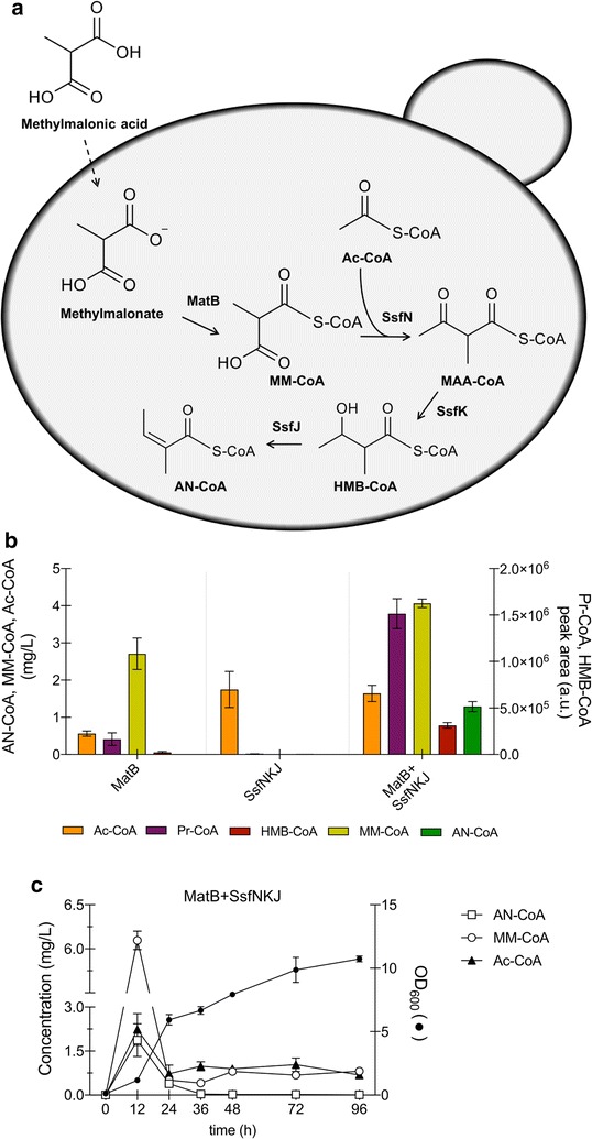 Impact of methyl-malonic acid feeding on AN-CoA production. a Graphical representation of the pathway starting with methyl-malonic acid feeding. b Intracellular accumulation of Ac-CoA (orange bars), Pr-CoA (purple bars), MM-CoA (yellow bars), HMB-CoA (red bars) and AN-CoA (green bars) in strains expressing matB (ANG10), ssfNKJ (ANG11) and matB + ssfNKJ (ANG12), upon 12 h of growth. c Time course of production of AN-CoA (open squares), MM-CoA (open circles) and Ac-CoA (filled triangles) in strain expressing matB + ssfNKJ (ANG12), and corresponding optical density at 600 nm (filled circles). All engineered strains were incubated in selective SC medium, supplemented with 0.5 g/L methyl-malonic acid (all data: mean ± SD, n = 3)