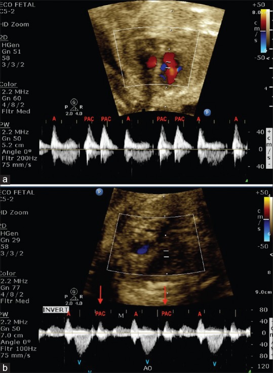 Simultaneous recording of the atrial and ventricular waves can also be obtained using Doppler ultrasound.[10] Conventionally, the sample volume is placed in the ventricular inflow and outflow tracts (mitral and aortic flows or tricuspid and pulmonary artery flows), which reflects the atrial and ventricular contractions [Figure 7]. Other sampling sites are as follows: (1) The superior vena cava (SVC) and aortic artery flow by rotating 90° from the 4-chamber view [Figure 8a] and (2) the pulmonary venous and pulmonary arterial Doppler on 4-chamber view [Figure 8b]. In both, a wave of the pulmonary vein or SVC corresponds to atrial contraction (A), and the pulmonary artery or aortic flow represents the ventricular contraction (V).