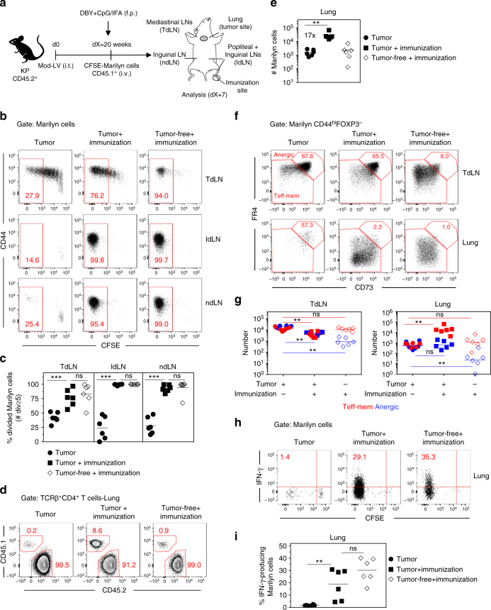 Priming of tumor Ag-specific naive CD4+ T cells at distant site from the tumor restores their effector functions. a Tumor-bearing mice having received CFSE-labeled naive Marilyn cells were immunized into the f.p. with DBY peptide (200 ng) and CpG (40 μg) emulsified in IFA or left untreated. Analysis was performed 7 days later. b Pattern of proliferation of Marilyn cells in the TdLN, lymph nodes draining the Ag injection site (IdLN = popliteal + Inguinal-LNs) and ndLN (non-draining LN = Inguinal) and c quantification (frequency of ≥5 divisions). d Representative plots showing accumulation of Marilyn cells in the lung of immunized tumor-bearing mice and e quantification (number). f Representative expression of CD73 and FR4 by CD44hiFOXP3− Marilyn cells and g quantification (number of anergic or Teff-mem cells) h, i Frequency of IFN-γ-producing Marilyn cells in the lung. One representative experiment out of two is depicted. ns: non-significant, **p<0.01, ***p<0.001 Mann–Whitney U test