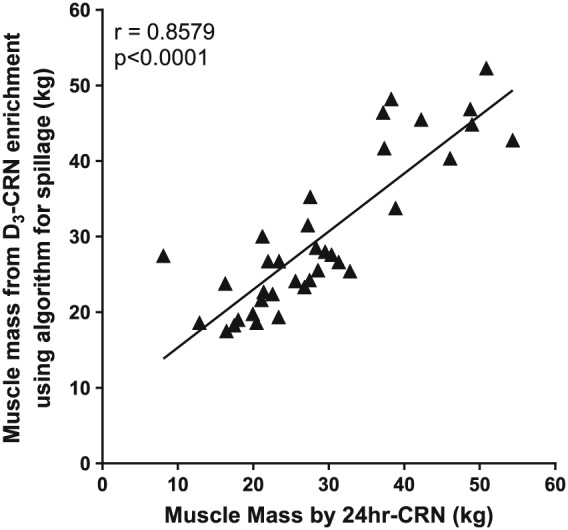 Correlation between muscle mass measured by D3‐Crn enrichment, corrected for spillage either by D3‐Cr excretion or by Cr/Crn algorithm.