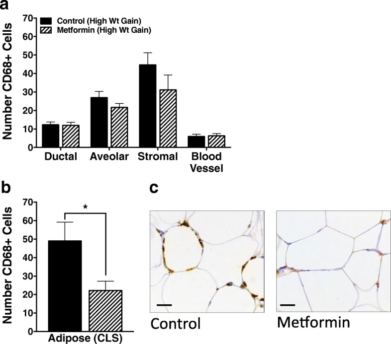 Crown-like structures, comprised of macrophages in close proximity to adipocytes, are a hallmark of chronic adipose tissue inflammation, and their presence in the mammary gland or breast has been associated with insulin resistance in both rodent and human studies [41]. In the breast, the macrophage marker CD68 has been used to identify crown-like structures that may otherwise be missed using H&E staining [42]. Thus, we quantified the number of CD68-positive (CD68+) cells in IHC-stained sections of mammary tissue from nontumor bearing mammary glands taken at the study end. We stratified animals into those with high versus low rates of weight gain during the post-OVX period, which are predicted to have high versus low inflammatory milieus, respectively. While we found no overall differences in the number of CD68+ macrophages associated with mammary ducts, alveoli, stroma, or blood vessels (Fig. 3a), metformin treatment in the high-weight-gain animals significantly decreased the number of adipose-associated macrophages forming crown-like structures (CLS) (Fig. 3b, c). Furthermore, in animals with low post-OVX weight gain, metformin had no effect on the number of adipose-associated CD68+ cells (36.8 ± 10.8 vs 25.7 ± 4.8, metformin vs control; p = 0.321), suggesting that metformin may be specifically effective at decreasing the inflammation induced by weight gain following OVX. The decrease in crown-like structures in metformin-treated high-weight-gain animals suggests that, in addition to improving whole-body metabolic function (liver data above), metformin also contributes to adipose-specific metabolic improvements. Combined, these studies support beneficial effects of metformin on both whole-body metabolic health and mammary adipose tissue inflammation, which we anticipated may underlie the antitumor effects of metformin.