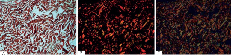 The special dye picrosirius red has the ability to enhance the natural birefringence of the collagen when exposed to polarized light. Collagen type I would show a yellow-red color, while type III would be green.8 On the other hand, Lattouf et al.9 stated that this special stain highlights the configuration of the collagen and the heterogeneity of the direction of the fibers in the tissues, with no differentiation between the types (Figure 1).