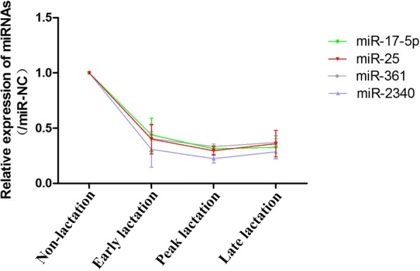 To explore potential miRNAs involved in the regulation of lactation, we analyzed the expression patterns of 715 miRNAs from goat mammary glands at four different stages, including non-lactation, early, peak and late lactation using the S-poly(T) plus miRNA quantitative real-time PCR method (Fig. 1a). Among these 715 miRNAs, 122, 143 and 450 are from the domestic goat, sheep and cow databases, respectively (Additional file 3: Table S3). We found that 107 miRNAs were differentially expressed between early and peak lactation (Fig. 1b), and 144 were differentially expressed between peak and late lactation (Fig. 1c). A total of 20 common miRNAs are in the 200 most abundant miRNAs and in the 100 most variable miRNAs across lactation stages (Fig. 1d). Of these 20 miRNAs, levels of miR-17-5p, miR-25, miR-361 and miR-2340 were decreased until peak-lactation and increased thereafter (Fig. 2). Chen et al. revealed that miR-17-5p regulated lipid metabolism during goat lactation [6]. In this study, we focused on miR-25, whose expression level was the highest among these four miRNAs (Additional file 4: Figure S1).