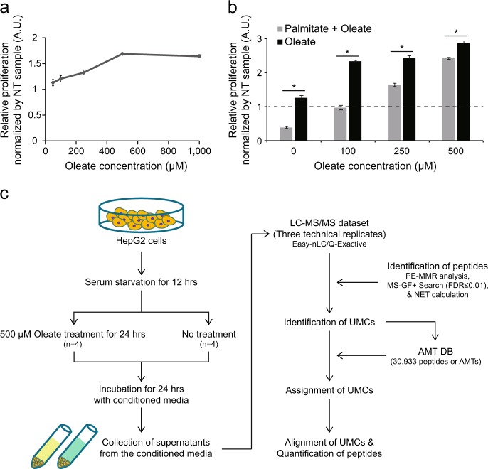 a, b MTT assays for measuring proliferation of HepG2 cells after treatment with different concentrations (50, 100, 250, 500, and 1000 μM) of oleate (a) and after cotreatment with palmitate (500 μM) and oleate (0, 100, 250, or 500 μM) (b). The data are shown as the mean ± SEM (n = 4). *P < 0.05 by Student’s t-test. The dashed line denotes the threshold of relative proliferation = 1. c An overall scheme for the secretome profiling. HepG2 cells were subjected to serum starvation for 12 h and then treated with oleate (500 μM). Oleate-treated (n = 4) and untreated (n = 4) samples were incubated for 24 h with conditioned media, and supernatants from the conditioned media were collected for sample preparation. LC-MS/MS analyses were performed for Peptide samples from oleate-treated and untreated samples with three technical replicates. The resulting LC-MS/MS datasets were analyzed using PE-MMR analysis, MS-GF + search, and AMT DB analysis for identification, assignment, and alignment of UMCs (see text)
