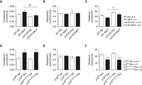 p16 global and lung epithelial cell–specific deletion shows differential response to lung mechanics after fMLP aerosolization and elastase injection. (A) Lung compliance, (B) resistance, and (C) elastance were measured in WT and p16 KO mice exposed to aerosolized Sal/fMLP after 21 days. Similarly, (D) lung compliance, (E) resistance, and (F) elastance were measured in p16fl/fl and p16CreCC10 mice treated with Sal/Ela injection after 21 days. Data are shown as mean (±SEM) (n = 3–8 per group). *P < 0.05, **P < 0.01, ***P < 0.001, significant compared with respective air-/Sal-exposed controls; #P < 0.05, ##P < 0.01, significant compared with WT fMLP.