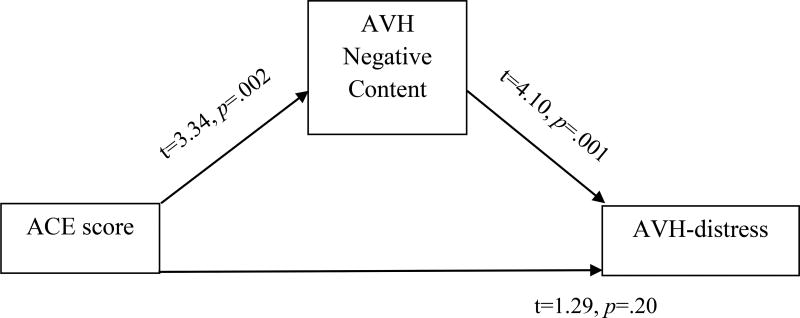 Note. Total effect of ACE score on AVH-distress is significant, b=0.26, SE=0.09, 95% CI=0.08 – 0.44, p=.006. Indirect effect of ACE score on AVH-distress via AVH negative-content is significant, b=.14, SE = 0.05, 95% CI = 0.05 – 0.30, p<.05.