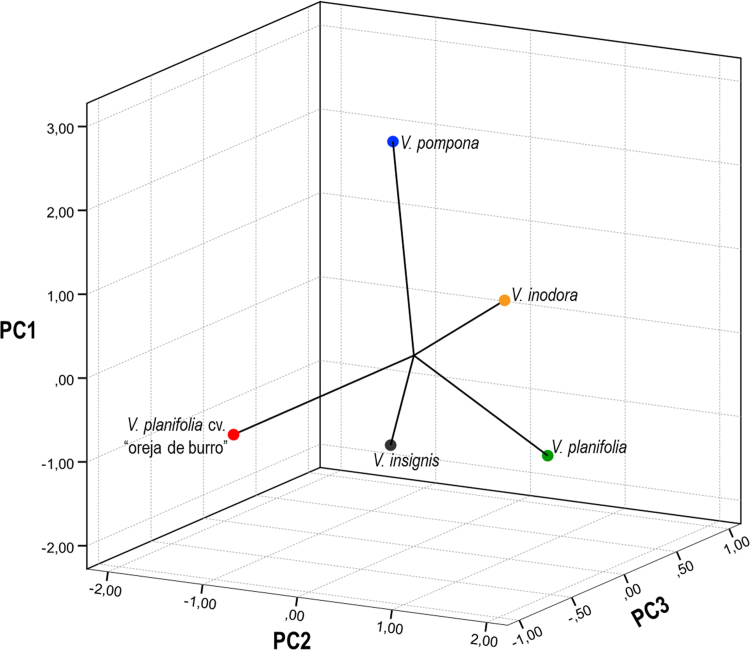 The principal component analysis was performed using phytochemical data that only included three variables (Table 5) of six analysed. Therefore, dispersion of phytochemical data on all Vanilla species that was analysed was determined by the three first principal components which explained 92.4% of the total variation of this study (Table 6). The first principal component (PC1) explained around 51.9% of the total variation and was represented by flavonoids in stems (FS) (Table 6). PC2 explained 23.2% of the total variation and was determined by phenols in leaves (PL) and terpenes in stems (TS). The third principal component (PC3) explained only 17% of the total variation and was determined by flavonoids in leaves (PL) and terpenes in leaves (TL) (Table 6). Spatial distribution of phytochemical data on five Vanilla species is shown in Fig. 5, which was obtained by principal component analysis. Therefore, the phenols, flavonoids, and terpene concentration in leaves and stems were assembled into the dendrogram in Fig. 6. With these phytochemical data, clado analysis identified the following pattern: 1) V. planifolia cv. “oreja de burro” and V. insignis, 2) V. planifolia, 3) V. pompona and 5) V. inodora.