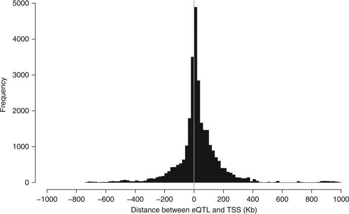 The histogram shown the distribution of the distance between the significant cis-eQTL and the gene TSS in Kb. Most of the eQTL are within 200 Kb of the gene TSS