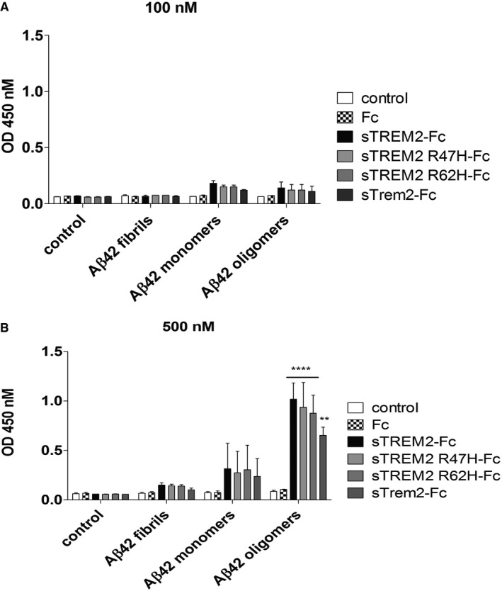 A, BELISA plates coated with soluble TREM2‐Fc and AD variants were incubated with various concentrations of Aβ42 aggregates or monomers or oligomers: (A) 100 nM and (B) 500 nM. Results were expressed as the OD450 averaged ± standard error (n = 2, **P < 0.01, ****P < 0.0001, two‐way ANOVA, Bonferroni multiple comparisons, compared to Fc, see Appendix Table S4 for exact P‐values).