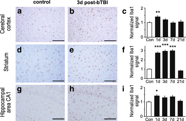 Induction of activated microglia after mild bTBI. a-i Rats subjected to mild bTBI showed increased levels of activated microglia throughout the brain, including the brain regions: cerebral cortex (a-c), striatum (d-f) and hippocampal area CA1 (g-i). Representative images of brain regions stained for the ionized Ca2+-binding adaptor molecule 1 (Iba1), a marker of activated microglia, are shown for controls (a, d and g) and rats at 3 days post-bTBI (b, e and h). Bar graph of the normalized signal of Iba1 for corresponding brain regions for controls and rats at 1, 3, 7 and 21 day(s) post-bTBI is shown (c, f and i). Signal was quantitated on n = 6–9 slides from 3 individual rats for each treatment group (2–3 slides/rat). All scale bars indicate 100 μm. All data are presented as mean ± SEM; *p < 0.05, **p < 0.01, ***p < 0.001; ANOVA with Bonferroni post hoc