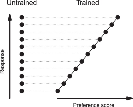 | Comparison, y-intercept at preference score 100 vs mean for untrained | ||||||