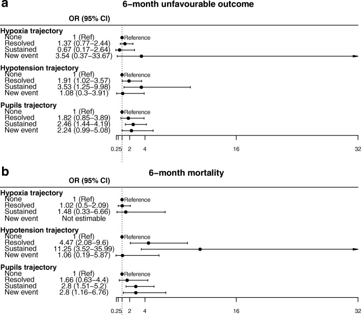 Univariate logistic regression was used to investigate the impact of trajectories of pupillary reactivity, hypoxia, hypotension, and their combination on 6-month outcome and mortality. Multivariate models aimed to identify the independent prognostic effect of trajectories of hypoxia, hypotension and pupillary abnormalities on 6-month unfavourable outcome and mortality were fitted after allowing for age, sex, intubation and sedation on scene, GCS, CT findings (Marshall score), presence of subarachnoid haemorrhage (SAH) and presence of any extracranial lesions. A complete-case analysis was carried out.