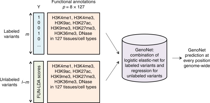 where is the penalized log-likelihood for the labeled data. Here we adopt Elastic-net because of its superior performance when the features are correlated and have sparse non-zero coefficients21. We further justify this choice of supervised algorithm for GenoNet via numerical simulations (Methods). are the labels for m variants with MPRA validated labels; are the predicted values for a large number (l) of variants from a prior unsupervised method. We adopt FUN-LDA score in the current GenoNet algorithm because it is one of only a handful of tissue-specific functional scores available genome-wide, recognizing that other unsupervised scores can be readily incorporated into GenoNet in the future18; Xi are the functional annotations; γI is a tuning parameter that controls how the unlabeled data are being used. When γI = 0, the method is fully supervised; when γI = ∞, the method is fully unsupervised (Supplementary Table 1). The tuning parameter γI is chosen to maximize the area under the receiver operating characteristics curve (AUROC) by tenfold cross-validation. The workflow is depicted in Fig. 1. We present the details in the Methods section.