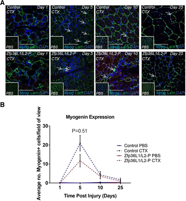 Terminal differentiation can occur independently of ZFP36L1 and ZFP36L2. Transverse cross sections of injured TAs from Zfp36L1/L2-P mice were immunostained with antibodies for Pax7 (red), myogenin (myog; turquoise), laminin (lam; green), and counterstained with the nuclear marker DAPI (blue). Controls represent Cre-negative littermates. a Representative images of injured control and Zfp36L1/L2-P TAs. Insets represent PBS-injected, uninjured contralateral TA muscles. Open arrows indicate myogenin+ myogenic cells (myog; turquoise). Scale bars: 100 μm. b Average number of myogenin+ cells present in injured control and Zfp36L1/L2-P TAs during the injury time course. Images were acquired using a × 40 objective lens. Calculations were based on 10 fields of view per experiment. Error bars represent the SEM, two-way ANOVA adjusted for multiple comparisons with Sidak’s post hoc test, n = 3