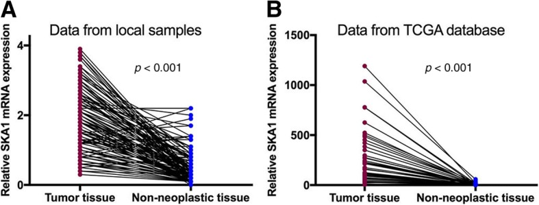 Real-time quantitative PCR was performed in HCC tissues and the matched non-neoplastic tissues to determine their SKA1 mRNA levels. The results indicated that SKA1 mRNA expression was significantly higher in tumorous tissues than that in non-neoplastic tissues (P < 0.001, Fig. 1a). Furthermore, our results were also verified by RNA sequencing data (RNASeqV2) from TCGA database which showed significantly higher SKA1 expression in tumorous tissues (P < 0.001, Fig. 1b and Additional file 1).