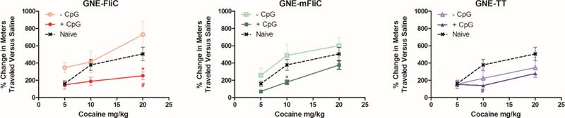 To assess our vaccine efficacy in blocking the pharmacodynamic effects of cocaine, vaccinated mice were subjected to a hyperlocomotion test (Figure 6). As expected, naïve mice exhibited elevated hyperlocomotor activity with increasing doses of cocaine. Interestingly, while FliC or mFliC vaccinated mice also showed robust hyperlocomotor activity when vaccinated without CpG, TT mice vaccinated without CpG exhibited some blockade of the cocaine effect at doses higher than 5 mg/kg.