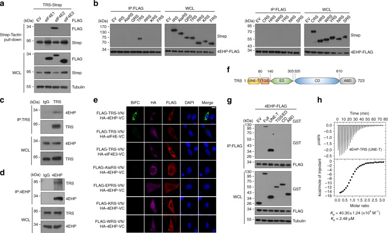 Human TRS interacts specifically with eIF4E2 (4EHP). a Pull-down assay of co-expressed TRS-Strep and eIF4E-FLAG isoforms in 293T cells. TRS-Strep was pulled down with Strep-Tactin beads, and co-precipitation of eIF4E isoforms was analyzed by immunoblotting with anti-FLAG antibody. b Immunoassay of co-expressed 4EHP-FLAG with human ARSs in 293 T cells. 4EHP-FLAG was immunoprecipitated with anti-FLAG antibody, and co-precipitation of ARSs-Strep was determined by immunoblotting with anti-Strep antibody. c Endogenous TRS immunoprecipitation with anti-TRS antibody in WI-26 cell lysates and co-immunoprecipitation of endogenous 4EHP determined using anti-4EHP antibody. Rabbit IgG was used as a negative control. d Co-immunoprecipitation of the above proteins confirmed in the reverse order. Rabbit IgG was used as a negative control. e Interactions between the indicated protein pairs determined by reconstitution of Venus green fluorescent protein (GFP) in Chinese hamster ovary (CHO) cells. Nuclei were stained with 4′,6-diamidino-2-phenylindole (DAPI; blue). Expression of HA-4EHP and FLAG-TRS was confirmed by immunofluorescence staining with anti-HA (Alexa 647; purple) and anti-FLAG (Alexa 594; red) antibodies, respectively. Scale bar = 10 μM. f Domain structure of human TRS determined based on the crystal and solution structures of E. coli (PDB 1QF6) and human (PDB 1WWT) TRS. g Immunoassay of co-expressed 4EHP-FLAG with full-length GST-TRS or the indicated domains in 293 T cells. Cell lysates were immunoprecipitated with anti-FLAG antibody, and co-precipitated TRS domain(s) were determined by immunoblotting with anti-GST antibody. h ITC determination of the binding affinity and stoichiometry of the TRS UNE-T region and 4EHP. Raw data and the integration plot are displayed in the upper and lower panel, respectively. Data are representative of at least three experiments, each with similar results (a−e, g, h). EV empty vector, WCL whole cell lysate, VN venus N-domain, VC venus C-domain, UNE-T unique region extension at the N-terminus of TRS, TGS a domain named after TRS, GTPase and SpoT, ED editing domain, CD catalytic domain, ABD anticodon-binding domain