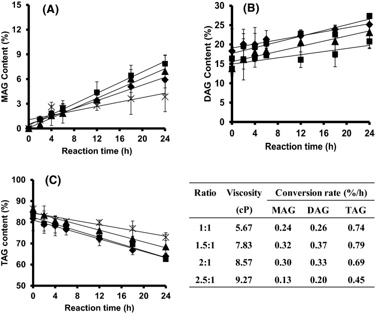 Synthesis of SLs by the glycerolysis–interesterification reaction requires glycerol to convert TAG to MAG and DAG. The MAG and TAG conversion rates increased as the glycerol to fat ratio was increased from 1:1 to 1.5:1 (Fig. 3A, C). The MAG and TAG conversion rates increased about 1.33 times and 1.25 times, respectively. However, the DAG conversion rate was not significantly different. An increase in the glycerol fraction from 1:1 to 1.5:1 lead to an increase in the reactant equilibrium and the MAG and TAG conversion. However, a further increase in the glycerol to fat ratio (2:1) did not have a significant effect on the MAG, DAG, or TAG conversion rates (Fig. 3). The conversion rates decreased at a higher glycerol to fat ratio (2.5:1). This was due to an increase in the reactant mixture viscosity at a higher glycerol fraction. The viscosity of the reaction mixture increased about 1.6 times as the glycerol to fat molar ratio was increased from 1:1 to 2.5:1 (Fig. 3). An increase in viscosity affected the mass transfer of the substrates to the enzymes. Glycerol is hydrophilic; hence, it can interfere with the reaction system because the fat and immobilized lipase are favor in hydrophobic. Thus, a high amount of glycerol formed a coating around the enzyme, which inhibited enzyme activity, and lowered the conversion rates of MAG, DAG, and TAG (Cheong et al., 2007; Naik et al., 2014). Thus, the glycerol to fat molar ratio of 1.5:1 was chosen for further experiments.