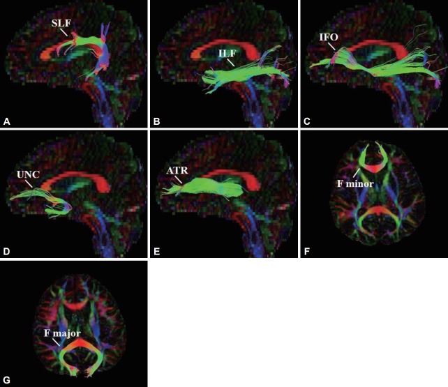 Reconstruction of selected tracts. A: Superior longitudinal fasciculus (SLF). B: Inferior longitudinal fasciculus (ILF). C: Inferior fronto-occipital fasciculus (IFO). D: Uncinate fasciculus (UNC). E: Anterior thalamic radiation (ATR). F: Forceps minor (F minor). G: Forceps major (F major).