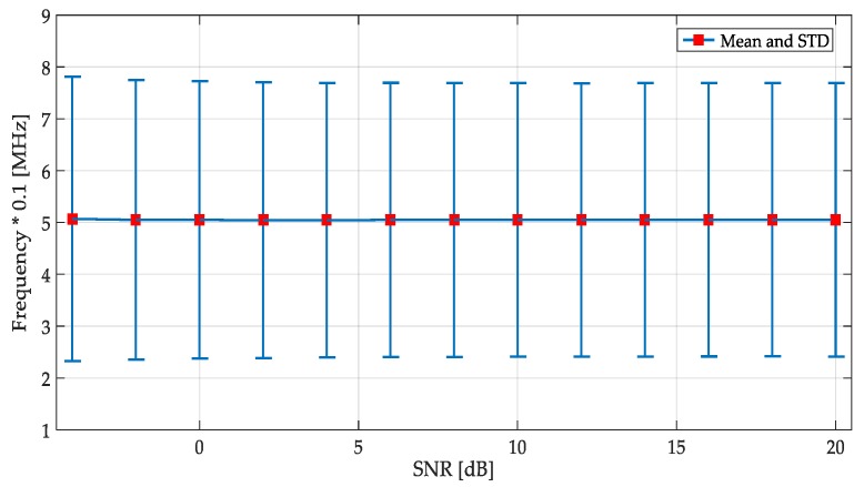 A study of the accuracy in the frequency edge detection was done again. The results are displayed in Figure 18. These results show a better performance regarding the results obtained for the first methodology, diminishing the frequency deviation from the true simulated values to 2.4 samples (around 2.4% of true frequency deviation). The standard deviation was also diminished by 2. However, this edge detector was less precise (more susceptible to high noise levels) with very low SNR, in comparison with the detector based on the CWT modulus maxima.