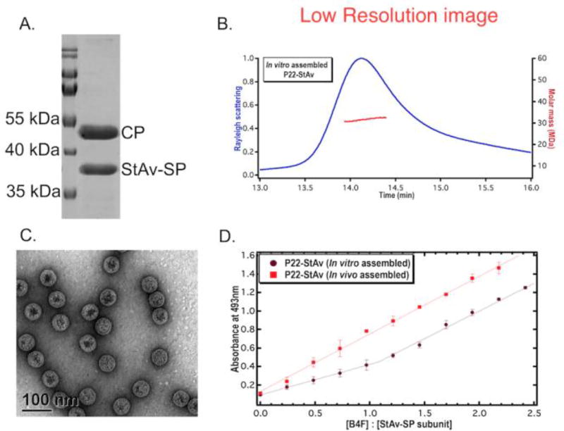 Analysis of purified in vitro assembled P22-StAv particles. (A) SDS-PAGE analysis showing two bands corresponding to CP (~47 kDa) and StAv-SP (~35 kDa) confirms the encapsulation of StAv-SP. (B) SEC-MALS shows the monodisperse population of P22-StAv (blue trace) and distribution of particle weight (MW) across the peak (red trace). (C) TEM image shows that morphology and size of the P22 is maintained during in vitro assembly. (D) Binding activity of an in vitro and in vivo assembled P22-StAv particles, evaluated by titrating biotin binding sites with biotin-4-fluorescein (B4F). Binding of B4F to StAv results in reduction of the B4F absorbance at 493 nm until all sites are saturated, after which slope changes and absorbance follows Beer’s law. With in vitro assembled P22-StAv particles, the change in slope indicates the functionally active state of particles and the break point at which slope changed provides 1:1 binding stoichiometry of StAv-SP subunit to B4F. In case of in vivo assembled particles, the slope remains unchanged throughout the titration and reflects the lack of functional activity. The data were fit with a user-defined piecewise linear regression function. Error bars shows standard deviation of the mean.
