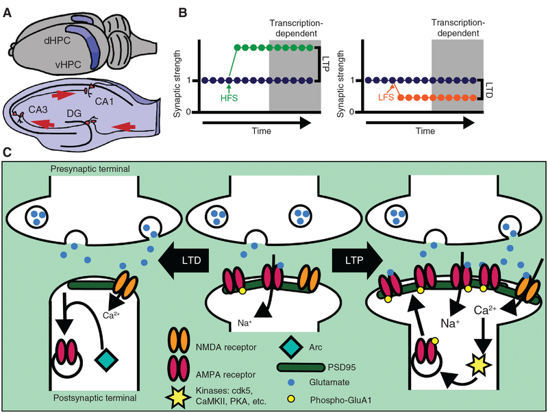 (A) Depiction of bilateral location of dorsal (dHPC) and ventral (vHPC) mouse HPC (top) and of a coronal slice of dHPC (bottom) showing the connections between the subregions and the general direction of glutamatergic projections (red arrows). (B) Graphical representation of LTP (left) and LTD (right) induced by HFS or LFS, respectively. Gray region indicates long-lasting change in synaptic strength requiring activity-dependent transcription. (C) Select molecular mechanisms of LTP and LTD at CA3–CA1 glutamatergic synapses involving products of genes regulated by activity-dependent TFs (see Table 1).