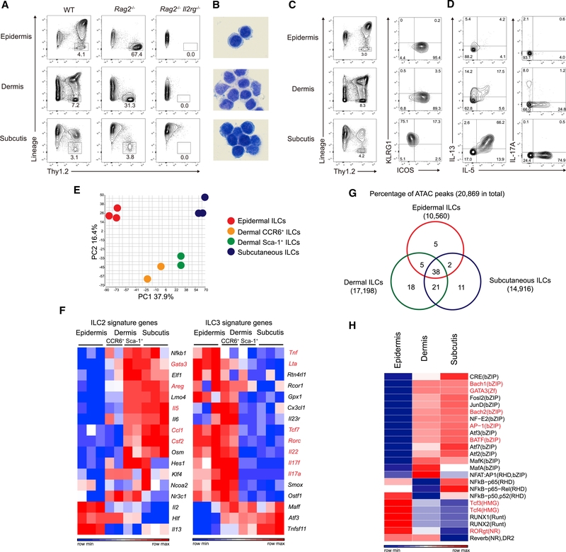 To investigate the identities and characteristics of ILCs in different anatomical skin layers, epidermis, dermis, and subcutis were separately isolated from the skin of wild-type C57BL/6 mice. Flow cytometry analysis of each layer revealed distinct populations that expressed Thy1.2 but lacked expression of lymphoid- and myeloid-lineage markers (Lin−) (Figure 1A). These Lin− Thy1.2+ cells persisted in T and B lymphocyte-deficient Rag2−/− mice but were eradicated in Rag2−/− Il2rg−/− mice. All Lin− Thy1.2+ cells from each skin layer displayed a typical lymphoid morphology with a high nucleus to cytoplasmic ratio (Figure 1B) and expressed IL-7Rα (Figure S1A), of which downstream signaling is critical for ILC development (Diefenbach et al., 2014). These data demonstrated that the Lin− Thy1.2+ cells were bona fide ILCs.