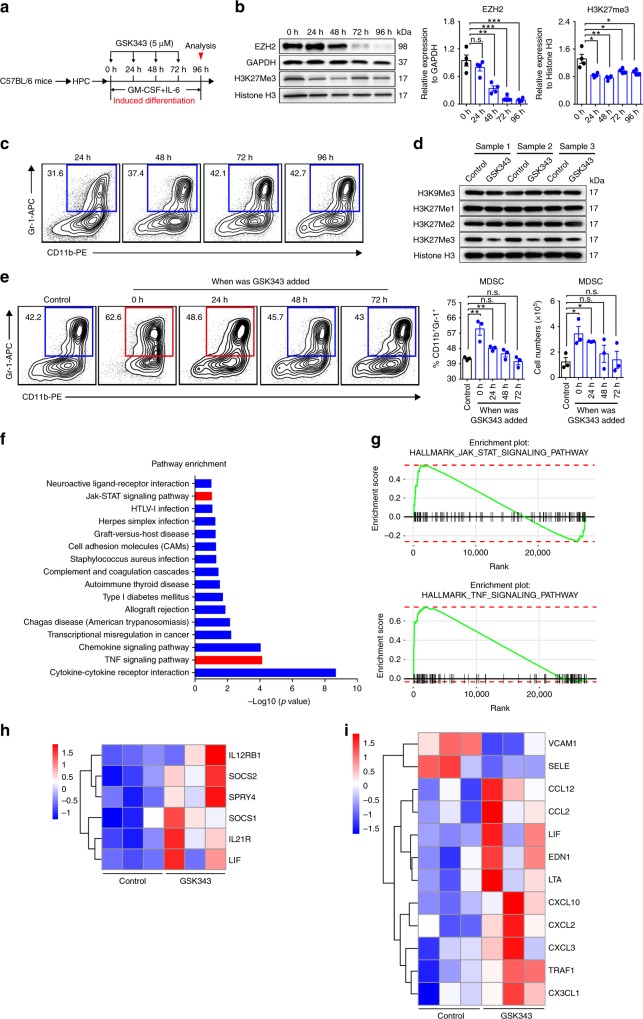 Inhibition of EZH2 activity promotes MDSC generation from HPCs. a–c Sort-purified HPCs from mouse BM cells were cultured with GM-CSF and IL-6 to allow induction of MDSCs in vitro. a Schematic of in vitro MDSC differentiation from mouse HPCs and experimental design for GSK343 treatment. b Immunoblotting of EZH2 and H3K27Me3 in GM-CSF/IL-6-induced cells at the indicated time points of induction. GAPDH and Histone H3 were used as loading controls (n = 4 per group). The statistical significance of differences is vs. 0 h of cell induction. c Representative flow cytometry plots of MDSCs (CD11b+ Gr-1+) induced by GM-CSF/IL-6. Gated numbers represent the percentage of CD11b+ Gr-1+ cells. d Immunoblots of H3K9Me3, H3K27Me1, H3K27Me2, and H3K27Me3 protein following treatment with GSK343 for 72 h. Histone H3 was used as a loading control (n = 3 per group). e As described in a, MDSCs were induced from mouse HPCs, vehicle (control), or GSK343 was added at different induction times. The total cells were collected at 96 h and representative staining, frequencies, and absolute numbers of developing MDSCs were assessed by flow cytometry. Numbers adjacent to the outlined areas indicated the percentage of CD11b+ Gr-1+ MDSCs (n = 3 per group). The statistical significance of differences was vs. control. f Signaling pathway enrichment analysis was performed using Kyoto Encyclopedia of Genes and Genomes (KEGG). Significantly enriched (nominal P < 0.05) pathways in in vitro-induced HPCs treated with or without GSK343 are plotted by enrichment score (n = 3). g Enrichment plot of the HALLMARK Jak-STAT and TNF signaling pathways for the comparison between in vitro-induced HPCs treated with vehicle (control) and those treated with GSK343. h Heatmap displays the differentially expression of Jak-STAT signaling pathway genes in vitro-induced HPCs treated with vehicle (control) and GSK343. i Heatmap illustrating the differentially expressed genes of TNF signaling pathway in vitro-induced HPCs treated with vehicle (control) and GSK343. Data shown are mean ± SEM and are representative of three independent experiments. *P < 0.05, **P < 0.01 ***P < 0.001, n.s. = not significant (as determined by one-way analysis of variance followed by Bonferroni post test). Source data are provided as a Source Data file