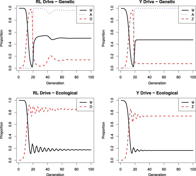 In this model, all evolution is limited to the drive locus because genetic variation in sib mating is not required when the level of sib mating increases ’ecologically’. We assumed that sib mating increases as mean fitness declines (Fig. 4, left). There is thus a parallel here with our haystack model (and a difference from the genetic control model) in that gene-drive evolution is being affected by purely demographic consequences of the gene drive’s effect on population size. The two types of demographic models do not parallel each other with respect to the type of demographic effect; however—one operates via extinction, the other operates by affecting the level of sib mating.