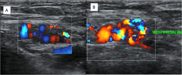 On color Doppler imaging—(A) in resting phase color filling of channels present (B) with valsalva increase in AP dimension of lesion and reflux of color seen.