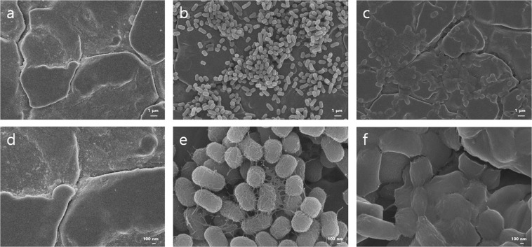 SEM images of E. coli O157:H7 biofilms on stainless steel surfaces: No inoculation (a,d); E. coli O157:H7 biofilm untreated (b,e) or treated with NaClO (c,f) at 20 ppm for 10 min. The biofilms were formed on a stainless steel surface in BHI at 25 °C for 24 h following 2 h preincubation for attachment. Magnifications and bar markers are ×10,000 and 1 μm long (a~c) or ×50,000 and 100 nm long (d~f), respectively.