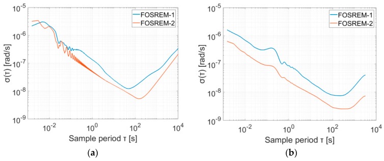 Finally, regarding the investigation of the system sensitivity, as well as its drift, the Allan variance analysis (AV) has been performed [23,24]. Figure 6 presents the results of these analyses for FOSREM-1 and -2. The data for AV were gathred at MUT in Warsaw, Poland for two positions of the FOSREM: on a sturdy flat floor in the basement of the laboratory and on an active optical table (Thorlabs, Newton - USA). Moreover, the data were recorded in nightly hours to reduce urban noise. The plots presented in Figure 6 point out that the appropriate method of error estimating is significant, but environmental conditions are crucial and they can provide false results. The parameters of ARW (Angle Random Walk) and BI (Bias Instability) determined from data gathered when sensors were placed on the active optical table were more reliable. The plot in Figure 6a is more disturbed, and the values of ARW and BI based on this plot have a higher value (Table 1). The disturbances in Figure 6b are results of resonance characteristics of the applied table, nevertheless, it indicates lower values of ARW and BI; ARW is equal to 8.66 × 10−8 rad/√s and 2.45 × 10−8 rad/√s, whereas BI has a level of 1.13 × 10−8 rad/s and 3.91 × 10−9 rad/s for FOSREM-1 and -2, respectively.