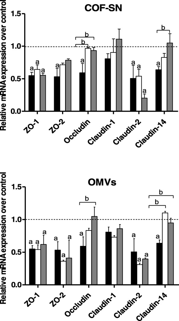 Effect of the secreted fractions (COF-SN and OMVs) from EcN and ECOR63 on the expression of TJ proteins in T-84 monolayers infected with EPEC. Intestinal epithelial cells were incubated for 3 h with EPEC at a MOI of 100 (black bars). Parallel infections were carried out in the presence of COF-SN (0.5 mg/ml) or OMVs (0.1 mg/ml) from EcN (white bars) or ECOR63 (gray bars). The relative mRNA levels of the indicated proteins were measured by RT-qPCR using β-actin as the reference gene. Data are presented as fold-change compared to untreated control cells (dotted line) from three independent biological experiments. a, Significance against untreated control cells (p ≤ 0.05); b, significance against EPEC-infected control cells (p ≤ 0.04)