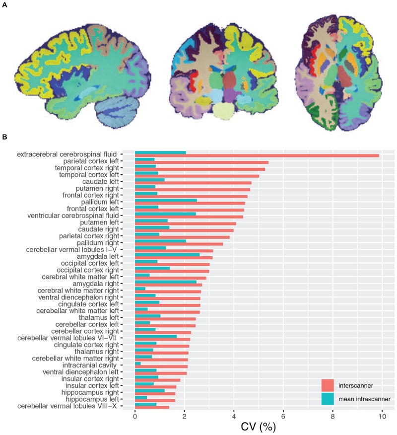 A CV of value 0 would represent perfect reproducibility, while a greater value represents a larger SD relative to the mean of the sample. CV is an ideal measure of reproducibility of brain volume measurements because it is a dimensionless value relative to the size of the structure of interest. The analysis was completed using R software version 3.5.1.