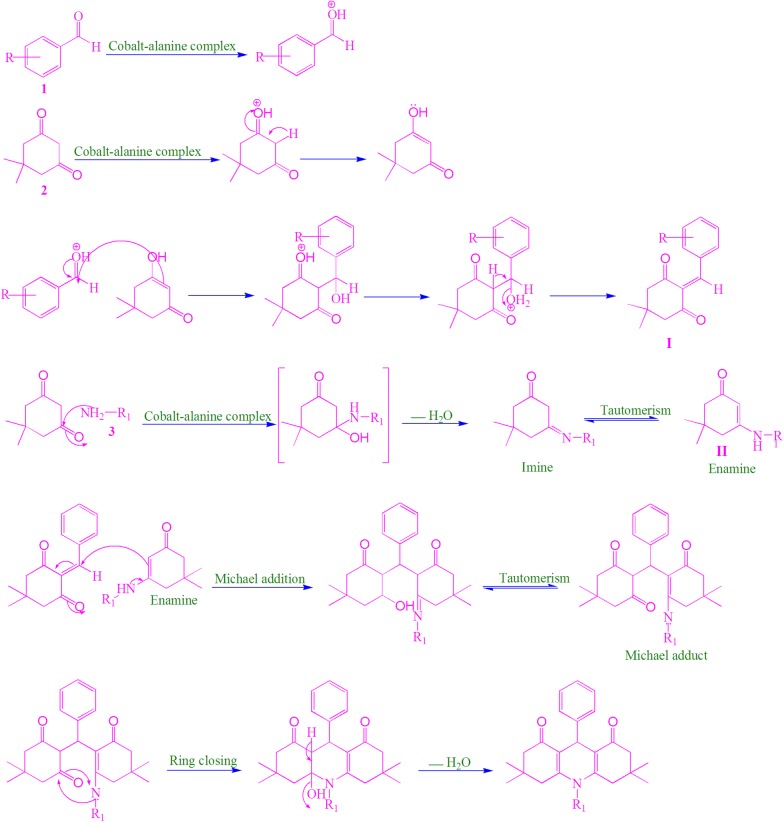 A plausible mechanism for the formation of the 1,8-dioxodecahydroacridine products using cobalt–alanine metal complex as a catalyst has presented in Scheme 2.