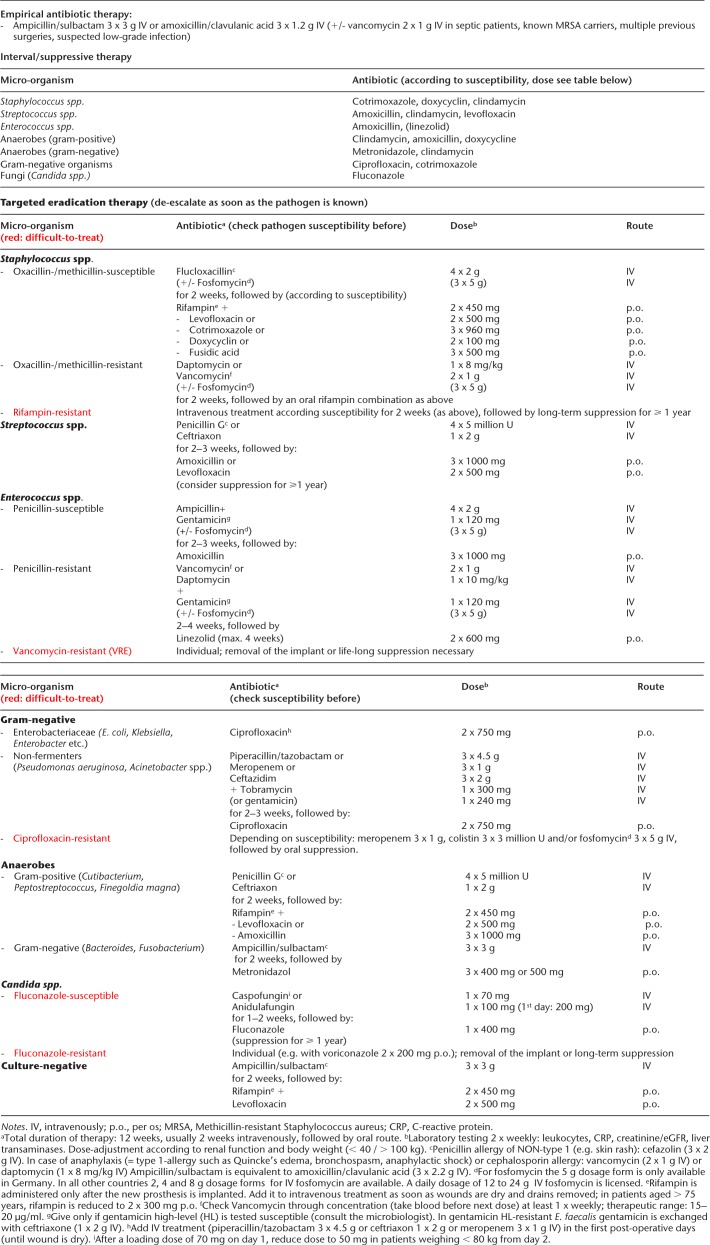 The use of biofilm-active antibiotics enables eradication of micro-organisms in the presence of a foreign body. The total duration of antibiotic treatment following revision surgery should not exceed 12 weeks.