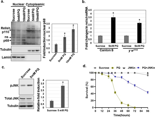 Based on the transcriptomic analysis data that revealed differential regulation of immune system genes, with an upregulation of cellular immunity genes but a suppression of AMPs, we next explored the effect of PQ exposure on the levels of the transcription factor Relish, the fly ortholog of mammalian NF-κB. In Drosophila, Relish/NF-κB is mainly activated via the IMD pathway, where it plays a key role in regulating the humoral immune response through the production of AMPs, such as attacin, diptericin, and cecropin. Relish regulates the inducible immune response in Drosophila through signal-dependent translocation into the nucleus; its functions are highly conserved with mammalian NF-κB56. The full-length, 110 kD Relish protein is activated in the cytoplasm by proteolytic cleavage resulting in a 68 kD protein, which is subsequently translocated to the nucleus leading to the regulation of gene expression, and a 49 kDa protein, which remains cytosolic. To determine whether Relish is activated and translocated to the nucleus upon PQ treatment, we performed cellular fractionation using heads of Canton S WT male flies treated with either sucrose (control) or PQ (5 and 10 mM). Nuclear fractionation and immunoblotting data revealed that PQ exposure resulted in a dose-dependent induction of the active nuclear form, p68, while the cytoplasmic full-length p110 form decreased, confirming that PQ elicits activation and nuclear translocation of Relish (Fig. 2a). In addition, relish transcript levels were also induced (around 3-fold) in response to 5 mM PQ treatment in two different wild type strains, Canton S and y w1118 as shown in Fig. 2b. Since 5 mM PQ was capable of inducing Relish activation, we used this concentration for subsequent experiments to better distinguish early responses to PQ exposure. Although relish transcripts were not differentially regulated in our single time point RNAseq screen after normalization, we did observe a marginal induction in the raw RPKM values in the PQ-fed group compared to the sucrose-fed flies.