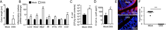 Mice used in this study were obtained from the Jackson Laboratories because animals from this vendor do not carry endogenous Enterobacteriaceae (12), thus offering experimental control over the presence of E. coli. To investigate how mucosal inflammation alters the ecosystem in the gut lumen, we induced colitis in mice by providing dextran sulfate sodium (DSS) in the drinking water. DSS treatment triggered colitis, as indicated by a reduction in colon length (Fig. 1A) and increased expression of proinflammatory genes in the colonic mucosa (Fig. 1B). Inoculation of DSS-treated mice with a commensal E. coli isolate of phylogroup B2 (E. coli Nissle 1917 wild type) revealed that colitis drove a marked expansion of this facultative anaerobic bacterium (Fig. 1C), thus modeling the expansion of Enterobacteriaceae observed in patients with IBD (9). Since limited oxygen availability is thought to maintain a microbial community dominated by obligate anaerobic bacteria in the colon (13), we investigated whether an expansion of facultative anaerobic E. coli was linked to a disruption in anaerobiosis (8). Oxygen is readily consumed by facultative anaerobic bacteria in the gut lumen, which impedes direct oxygen measurements. We thus assessed the bioavailability of oxygen using bacterial indicator strains that were either aerobic respiration proficient (E. coli Nissle 1917 wild type) or deficient for aerobic respiration under microaerophilic conditions due to genetic ablation of cytochrome bd oxidase and cytochrome bd-II oxidase (E. coli Nissle 1917 cydA appC mutant). We then compared the fitness levels of the aerobic respiration-proficient and aerobic respiration-deficient bacteria by inoculating mice with a 1:1 mixture of both bioindicator strains. The fitness advantage conferred by aerobic respiration was significantly larger in DSS-treated mice than in control animals (Fig. 1D), which supported the idea that DSS treatment increases the bioavailability of oxygen in the intestinal lumen. Similar results were obtained when the experiment was repeated at a later time point after the beginning of DSS treatment (see Fig. S1A, S1B, S1C, and S1D in the supplemental material), when marked inflammatory changes were observed by histopathological scoring of sections from the colon (Fig. S1E). Recent work suggests that anaerobiosis in the colon is maintained by colonic epithelial cells (colonocytes), which consume oxygen through oxidative phosphorylation in their mitochondria, thereby maintaining the epithelial surface in a state of physiological hypoxia (14). To detect hypoxia, mice were injected with pimonidazole 1 h before euthanasia. Pimonidazole is reduced under hypoxic conditions to hydroxylamine intermediates that irreversibly bind to nucleophilic groups in proteins or DNA and can be detected by an antibody (15, 16). Pimonidazole staining revealed that the colonic surface of mock-treated mice was hypoxic. Notably, DSS-induced colitis resulted in a loss of epithelial hypoxia (Fig. 1E and F), suggesting that colitis was associated with increased epithelial oxygenation.