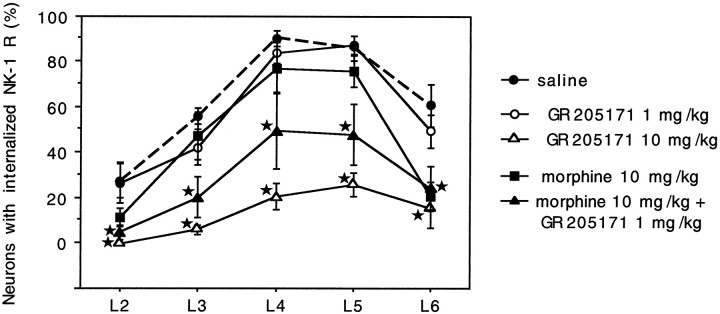 Our inability to produce a profound or consistent reduction of NK-1 receptor internalization with systemic morphine alone may have resulted from a saturation of the noxious stimulus-induced response. To test this possibility we coadministered morphine with a low dose of an NK-1 receptor antagonist. We found that the combined administration of morphine (10 mg/kg, s.c.) and GR 205171 (1.0 mg/kg, s.c.) at doses that were ineffective when administered alone, significantly (p < 0.0001) decreased the number of neurons that internalized NK-1 receptor in response to noxious stimulation (Fig. 5). Internalization in the group that received both morphine and the NK-1 receptor antagonist was decreased by 45% in the L4 segment compared with the saline-treated group. The rats that received the two drugs concurrently also showed a significant reduction in the percentage of cells showing internalization compared with the group that received morphine alone (p < 0.01) or the group that received GR 205171 at 1.0 mg/kg (p < 0.01). On the other hand, the combination was significantly less effective in reducing internalization of the NK-1 receptor (p < 0.05) than was the NK-1 receptor antagonist at the highest dose (10 mg/kg).